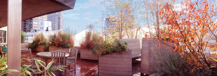 Designed for an Upper Eastside family, their home now extends well beyond the boundary of their confined apartment. From everyday life rituals, to those occasions shared with a circle of good friends, this nurturing respite provides a counterpoint to compressed interior lives. Undulating white netting surrounds the perimeter while an "outdoor chat room" sits on the corner. These high back bench/planters afford a sense of enclosure while conversing with a friend under a stand of birch trees. The busy New York intersection below can be barely heard while dramatic views down the avenue dazzle the eye. A twisted portal leads to a garden of secrets... a more secluded and intimate space outside the master bedroom. The project resulted from a fruitful collaboration with the designer Frances Levine... a "mover and shaper of landscape." |